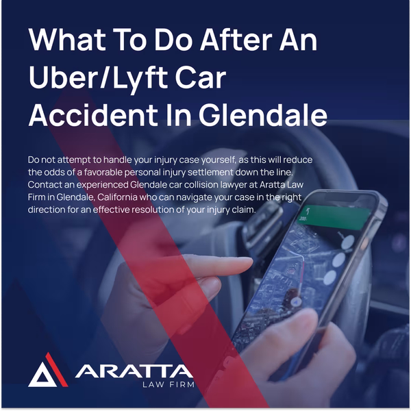 If you were injured in a rideshare car accident as a passenger or a driver, seek medical attention right away by either calling 911, going to the emergency room or an urgent care. Next, contact an experienced Glendale car collision lawyer at Aratta Law Firm in Los Angeles, California who can navigate your case in the right direction for an effective resolution of your injury claim. Do not attempt to handle your injury case yourself, as this will reduce the odds of a favorable personal injury settlement down the line.